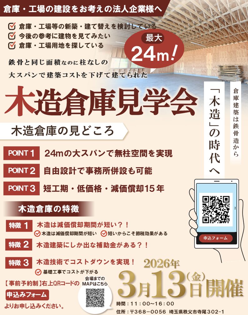 【中規模木造】約60坪の無柱木造倉庫 ~完成報告~