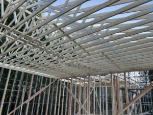 現場の写真をよく見ると、トラスの接合部には専用のメタルプレート(ネイルプレート)が使われているのが分かります。 これらは全て工場でプレカット・組み立てが行われてから現場に運ばれるため、職人の腕によるバラつきがなく、構造計算通りの極めて高い強度が確保されています。